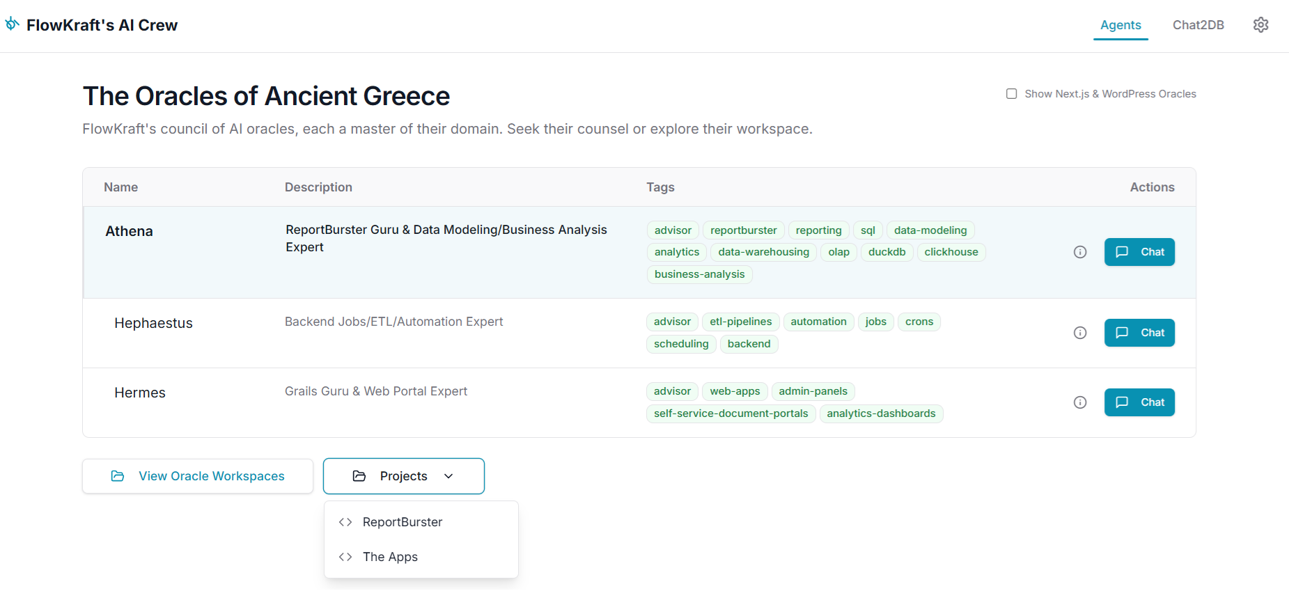The table lists three agents by default — Athena (ReportBurster Guru & Data Expert), Hephaestus (Backend & Automation), and Hermes (Grails Portals). The Show Next.js & WordPress Oracles checkbox in the top-right of the table toggles visibility of Pythia and Apollo.