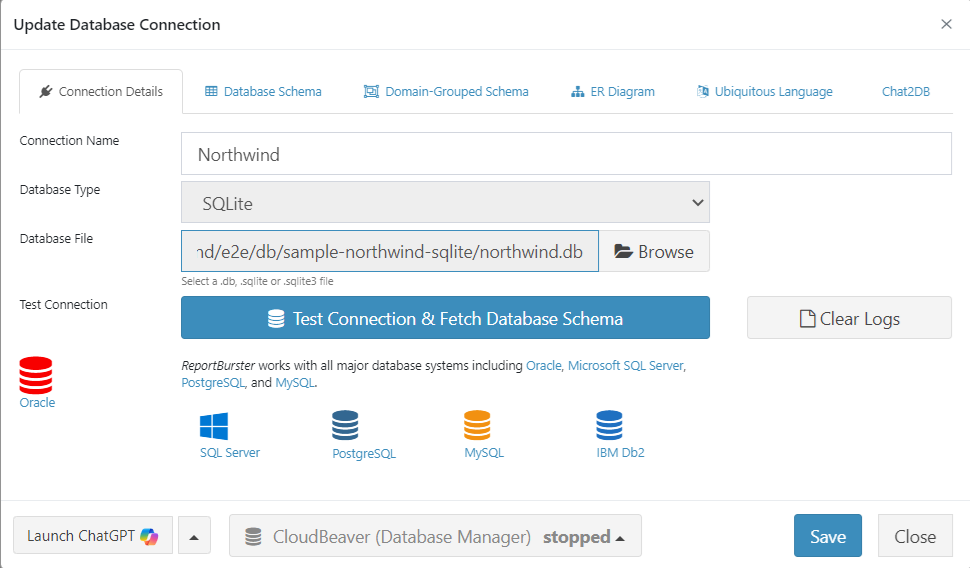 The sample Northwind SQLite database is included with ReportBurster — no Docker or external setup needed. Go to Configuration → Connections (Email, Databases) and configure your connection.