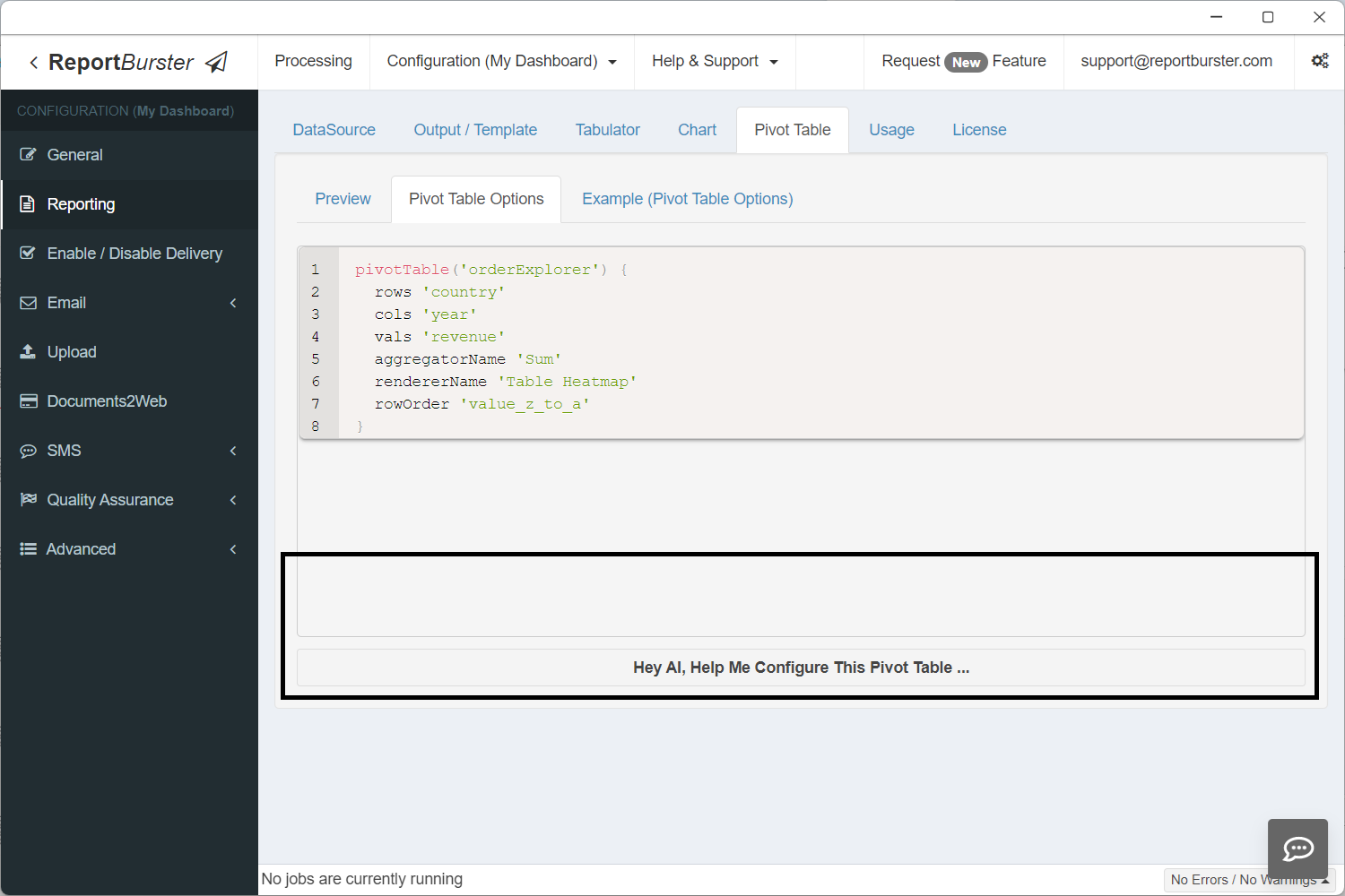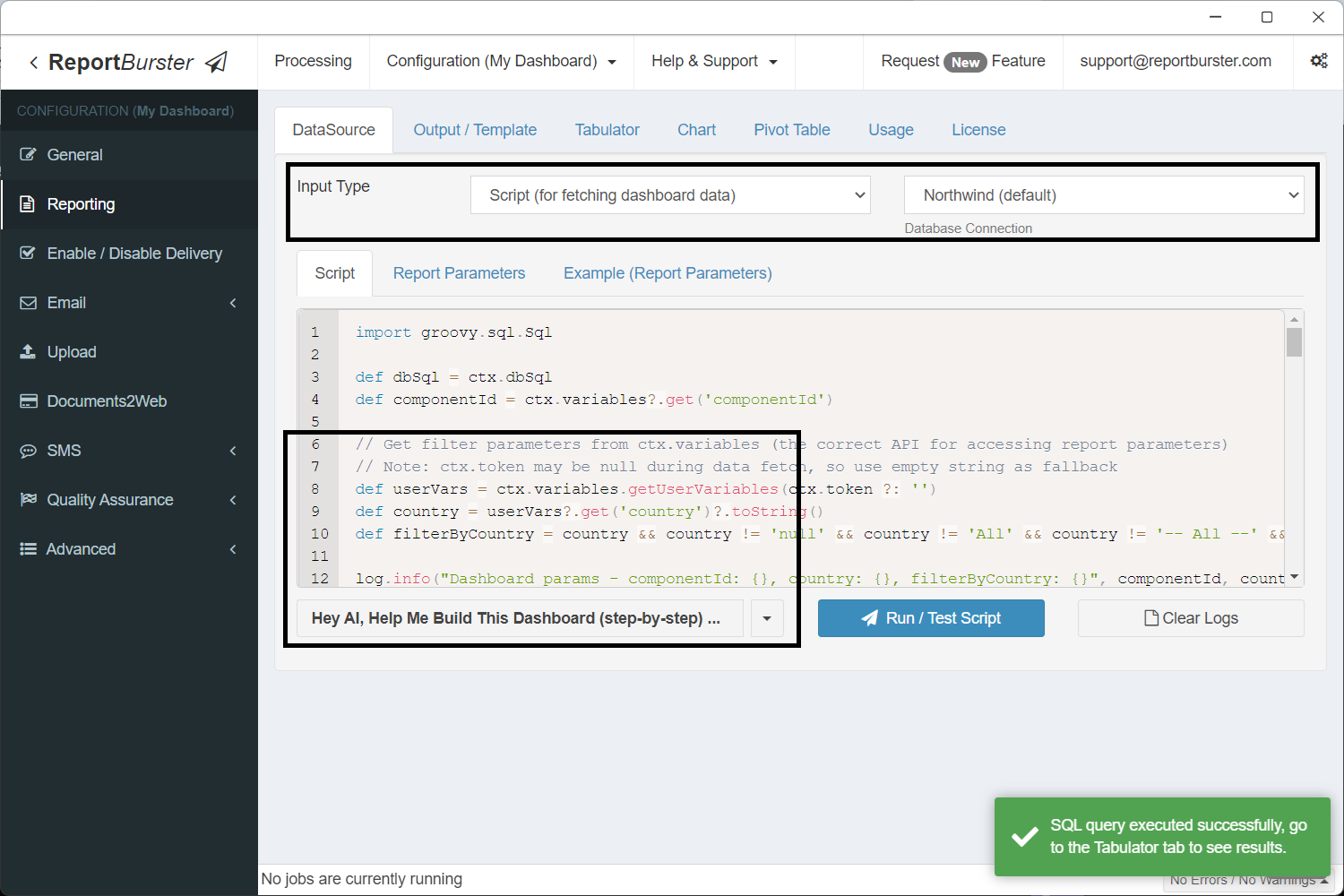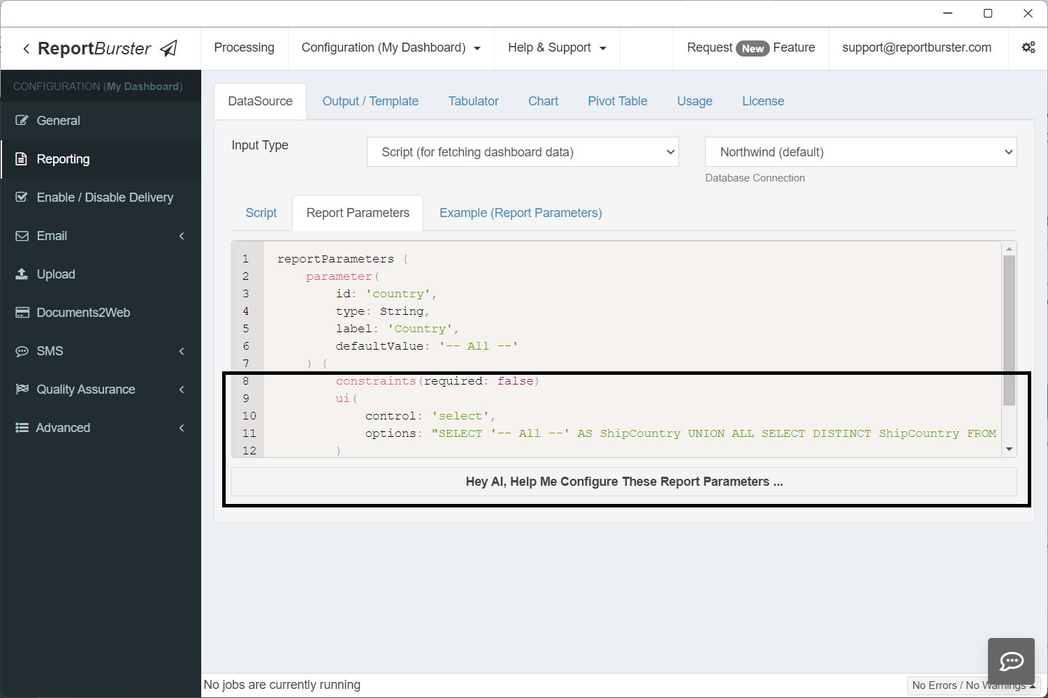 Note: Below you will see various code snippets — scripts, HTML templates, component configurations. None of this code needs to be written by hand. ReportBurster's built-in AI tools generate everything for you. Just click the "Hey AI, Help Me with..." buttons and describe what you need.