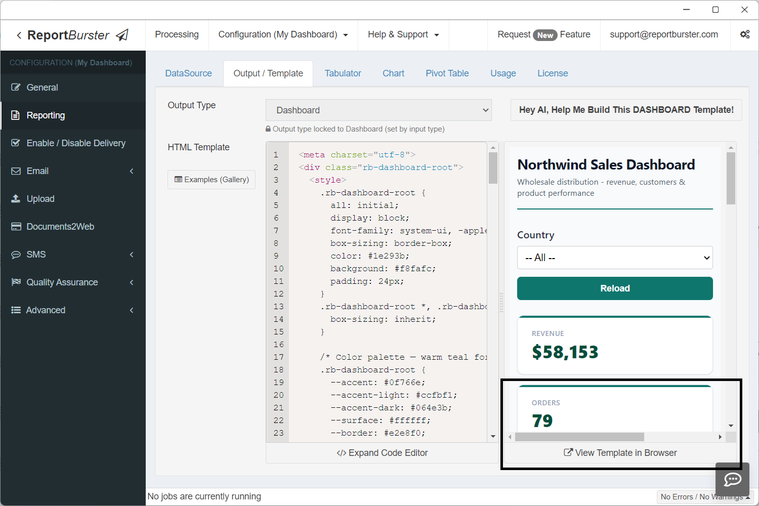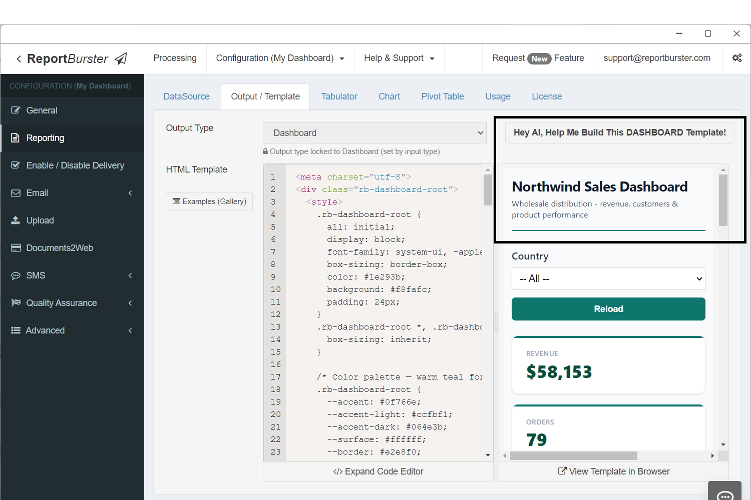 When building your own dashboards over your own data, you'd use the AI tools built into ReportBurster to generate all the code. We'll show you exactly where those buttons are at each step.