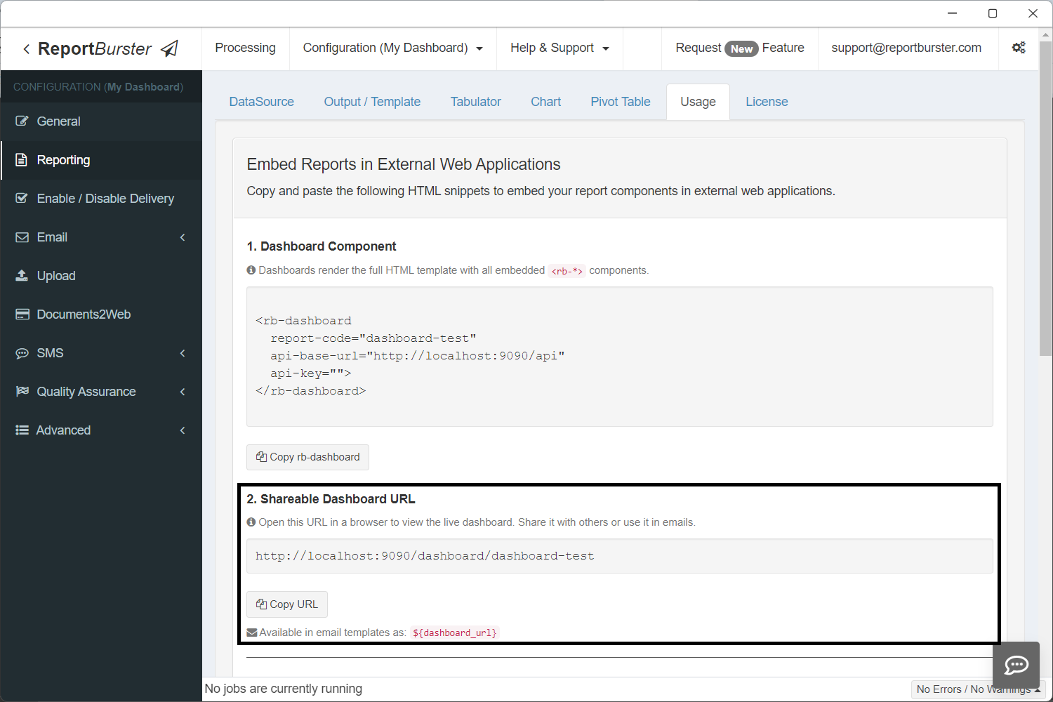 All dashboards created with ReportBurster are embeddable — go to the Usage tab to find how.