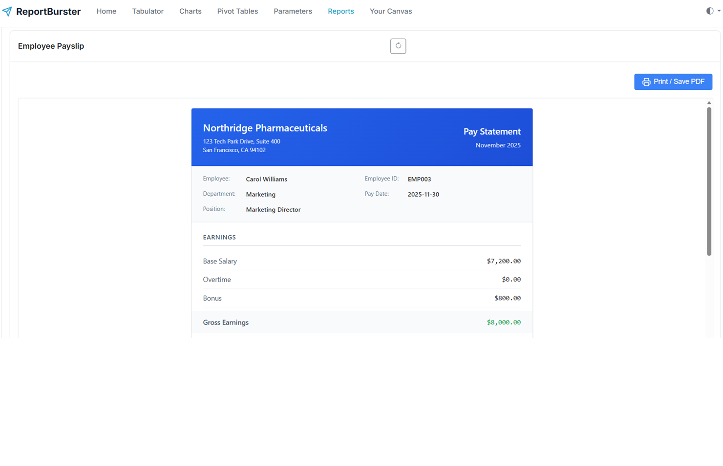 </rb-report>This renders the payslip for employee EMP001 with a print button.
